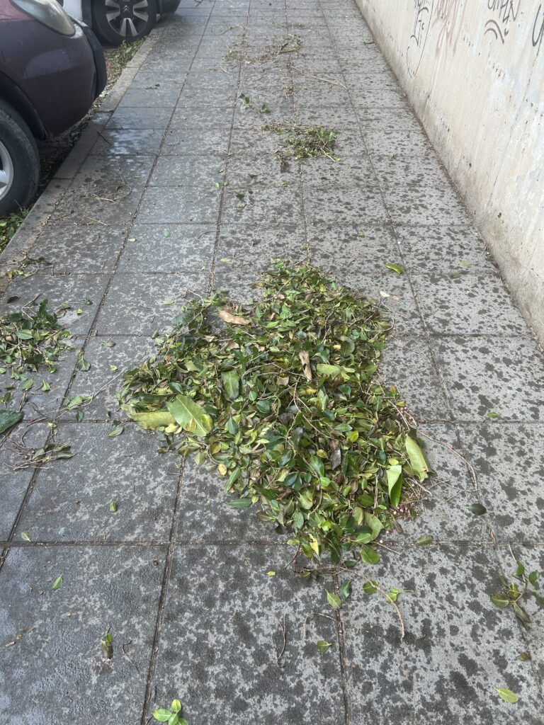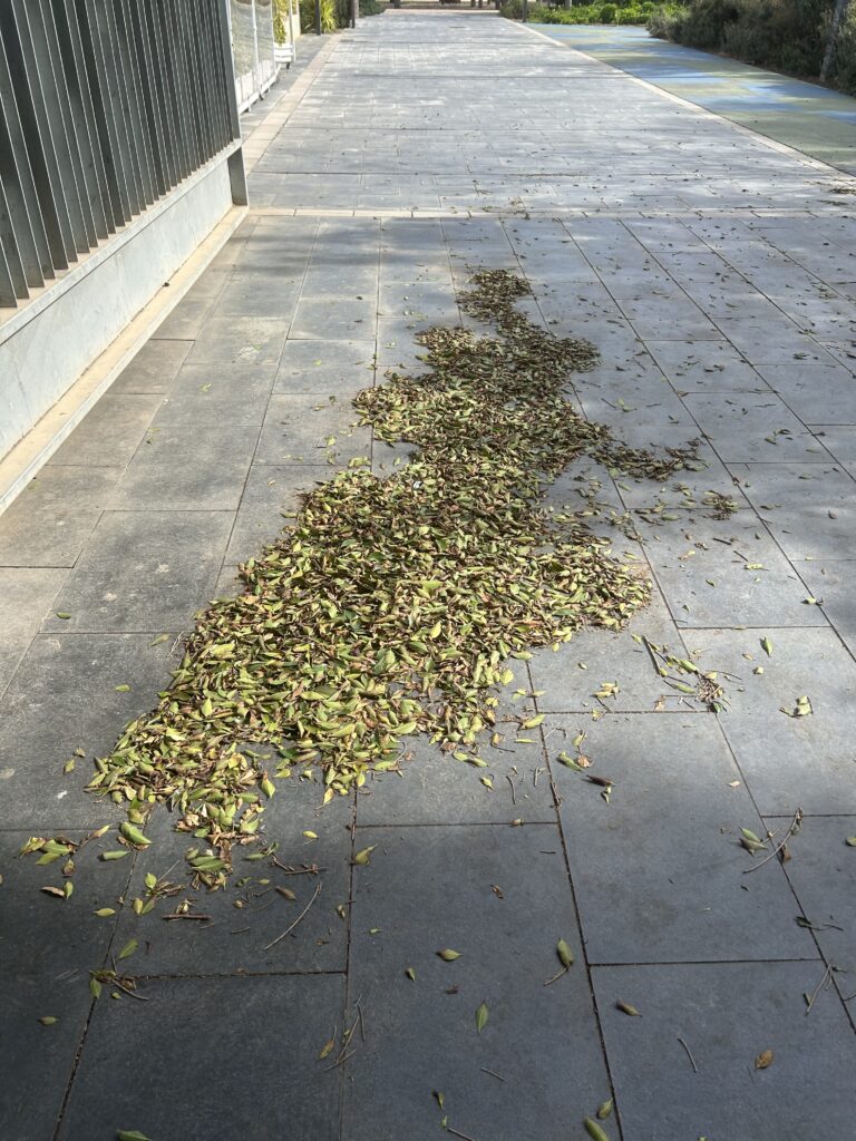permitiendo que el espacio activara el pensamiento. Observé parques cerrados para protegerlos del viento, hojas de ficus dibujando formaciones sinuosas ente la acción del viento y el espacio urbano, solares vacíos en espera de transformación. Las obras públicas alteraban recorridos y generaban pequeñas experiencias de extrañamiento.