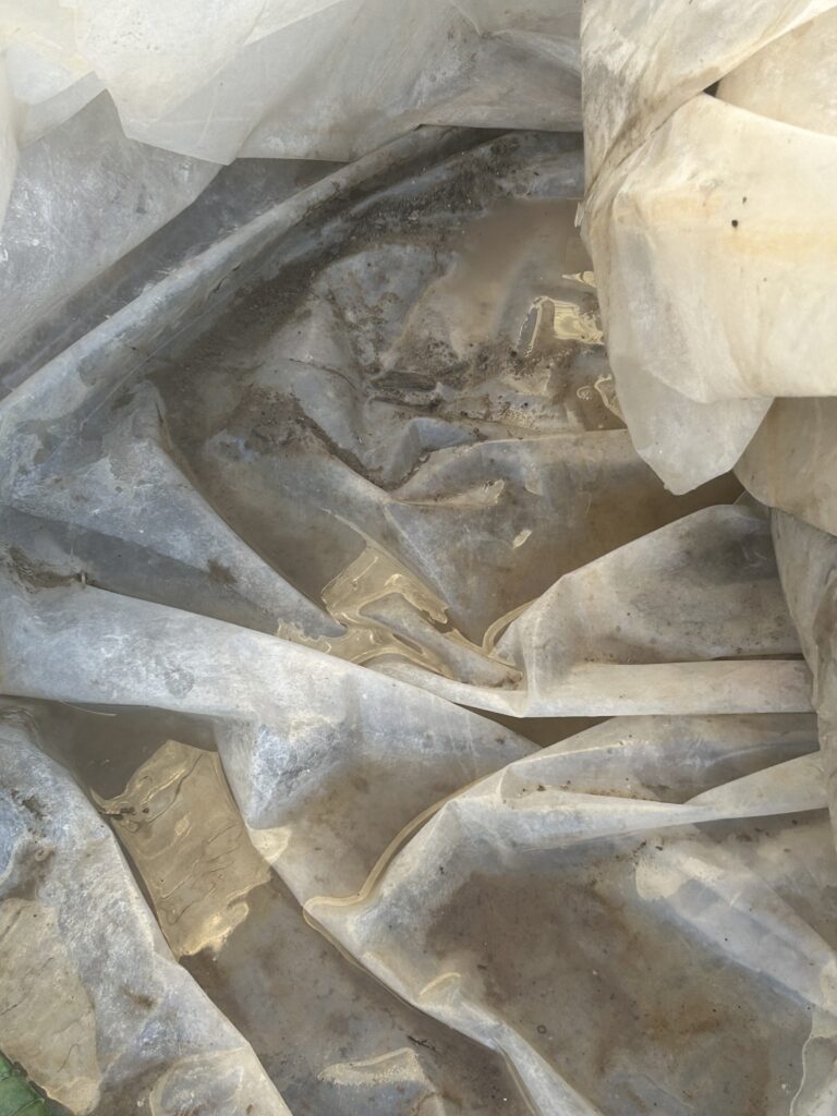 Gracias a la tutorización desde FOIE pude visitar un invernadero en Celín. Allí comprendí la dimensión arquitectónica del sistema productivo. El invernadero es una piel tensada, una estructura vulnerable que debe repararse continuamente frente al viento. De distintos materiales plásticos, entre ellos la rafia, el invernadero vibra, la luz se filtra, el sonido del aire golpea la superficie. Grabé la explicación del funcionamiento, pero el archivo se perdió. La pérdida reforzó la idea de que el sonido ya estaba incorporado al cuerpo; no necesitaba archivo para seguir trabajando. Pero durante mi visita también recorrimos las